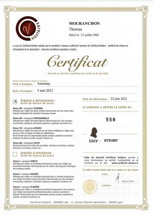 Vous y trouverez le certificat du Projet Voltaire que j'ai obtenu durant mon BTS SIO.